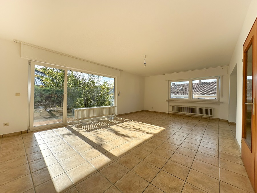Diese schöne 3-Zimmer Hochparterre-Wohnung erreichen Sie über eine kleine Treppe. Durch Ihren separaten Eingang gelangen Sie über den Flur in eine schöne, große Eingangshalle. Nach rechts erwartet Sie die Küche, welche sich perfekt eignet um die eigene Traumküche zu gestalten. Über eine Schiebetür kommen Sie in das angrenzende Esszimmer, mit einem offenem Durchgang zum großen Wohnzimmer. All diese Räume sind mit schönen, großen Fenstern ausgestattet. Das Wohnzimmer eignet sich optimal zur Gestaltung des Wohnmittelpunktes. Neben den großen Fenstern ist hier in Richtung Terrasse eine große Fensterfront mit eigenem Terrassenzugang. Hier fällt viel Licht durch, was den Raum schön erhellt. Über eine Tür gelangen Sie wieder in die Eingangshalle. Hier finden Sie unter anderem auch das modernisierte Gäste-WC mit Fenster. Wenn Sie aus der Eingangshalle in den weiteren Flur treten, finden Sie auf der linken Seite ein schönes Zimmer, welches sich größentechnisch optimal als Büro eignet. Von hier aus können Sie in den schönen Wald hinter dem Wohnhaus sehen. Zurück im Flur erwartet Sie rechts vom Büro das Badezimmer. Ausgestattet mit einem Waschbecken, WC und Dusche sowie einem Waschmaschinenanschluss. Auch dieses Bad wurde modernisiert und verfügt über ein großes Fenster. Am Ende des Flurs befindet sich das große Schlafzimmer. Neben einem schönem, großem Fenster haben Sie auch hier Zugang zur Terrasse. Die Terrasse dient zu Ihrer persönlichen Nutzung. Die Gesamtmiete setzt sich wie folgt zusammen: Kaltmiete von 1.200 € + 100 € für Garage und Stellplatz + 400 € Nebenkosten = 1.700 € Gesamtmiete. Die Wohnung ist ab sofort bezugsfrei!