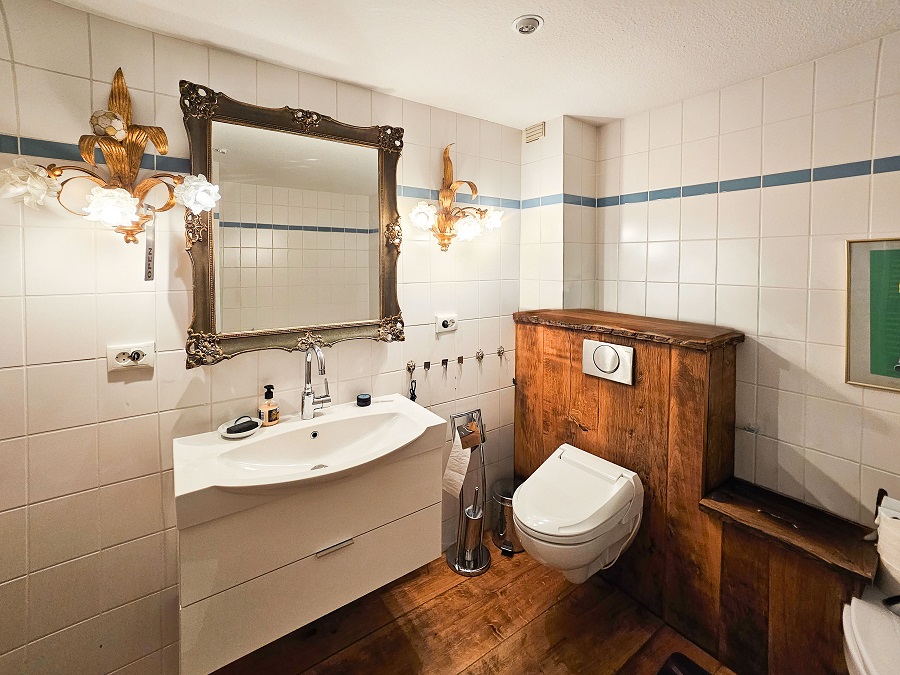 Das Badezimmer ist modern und geschmackvoll eingerichtet. Es verfügt über eine Badewanne und eine Dusche und bietet damit viel Komfort im Alltag. Der Echtholzboden sorgt auch hier für eine angenehme, wohnliche Atmosphäre und fügt sich harmonisch in das Gesamtbild ein.