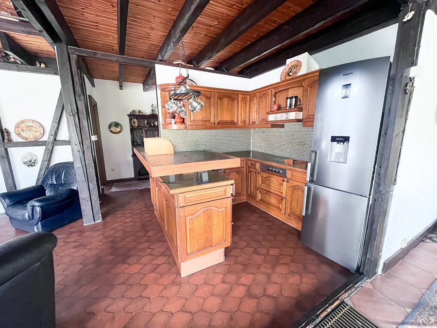 Bitte geben Sie Ihre komplette Adresse bei einer Anfrage an - damit wir Ihnen das Exposé schicken können. Auf einem großzügigen Grundstück von 1.005 m² erwartet Sie ein Landhaus mit ca. 130 m² Wohnfläche. Eine gelungene Kombination aus Fachwerkelementen, warmen Holzdetails und Helligkeit. Schon beim Eintreten spürt man die besondere Atmosphäre. Eine helle Diele empfängt Sie und gibt den Blick frei auf die charakteristischen schwarzen Fachwerkbalken, die dem Haus seinen unverwechselbaren Stil verleihen. Der offen gestaltete Wohn- und Essbereich mit integrierter Küche bildet das Herzstück des Hauses. Ein Highlight ist das Wohnzimmer: Hier sorgt die hohe Decke für ein beeindruckendes Raumgefühl und besondere Großzügigkeit. Der Kaminofen schafft eine behag-liche Atmosphäre. Durch die große Glasfront fällt viel Tageslicht ein und verbindet Innen- und Außenraum auf harmonische Weise. Der Essbereich mit seinen großzügigen Fensterflächen erinnert an einen Wintergarten und bietet direkten Zugang zur großen, überdachten Terrasse, ideal für gesellige Abende oder entspannte Stunden im Freien. Das Schlafzimmer im Erdgeschoss überzeugt mit einer nahezu durchgängigen Fensterfront. Das Tageslichtbad ist mit Dusche und Badewanne ausgestattet und setzt mit grünen Mosaikelementen stilvolle Akzente. Auch hier sorgt eine Glasfläche für angenehme Helligkeit. Ein separates Gäste-WC ergänzt diese Ebene. Im Dachgeschoss befindet sich eine gemütliche, offene Galerie, ideal als Homeoffice oder Rückzugsort mit Blick in den darunterliegenden Wohnbereich. Das Kellergeschoss erweitert die Nutzungsmöglichkeiten des Hauses und bietet vielseitige Optionen. Ein weiteres Schlafzimmer schafft zusätzlichen Wohnraum und eignet sich ideal als Kinderzimmer oder Gästezimmer. Besonders praktisch auf dieser Ebene ist das vorhandene Duschbad mit dekorativen Mosaikelementen. Ein zusätzlicher Abstellraum bietet praktischen Stauraum und kann alternativ auch als Ankleideraum genutzt werden. Der großzügige Raum mit direktem Ausgang ins Freie eröffnet zahlreiche Nutzungsperspektiven, beispielsweise als Hobbyraum, Fitnessbereich oder Atelier. Die Immobilie ist mit einer Fußbodenheizung ausgestattet. Die Gasheizung stammt aus dem Jahr 2002. Es sind zweifach verglaste Holzfenster verbaut. Modernisierungen können nach eigenem Maß und individuellen Vorstellungen vorgenommen werden. Die schön angelegte Hofeinfahrt unterstreicht den gepflegten Gesamteindruck. Rund um das Haus sorgt grüne Bepflanzung für eine angenehme Privatsphäre. Eine gepflegte Gartenhütte bietet praktische Abstellmöglichkeiten für Geräte oder Hobbybedarf.