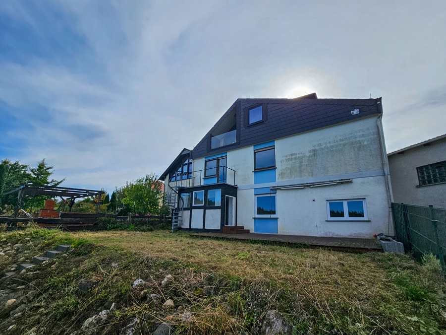 Dreifamilienhaus in Ortsrand- Aussichtslage mit Garage - Renovierungen erforderlich! Aufteilung und Wohnflächen: Erdgeschoss-Wohnung (ca. 85 m²) Flur Küche Wohnzimmer mit Zugang zur Terrasse Schlafzimmer mit Zugang zum Balkon sowie Wendeltreppe zum Garten Zimmer Badezimmer mit Eckwanne und Dusche Obergeschoss-Wohnung (ca. 55 m²) - Ausbau ca. 1999 Flur Offener Wohn-/Küchen-/Essbereich mit Zugang zum überdachtem Balkon Zimmer Badezimmer mit Eckwanne und Dusche Untergeschoss-Wohnung (ca. 62 m²) Flur Küche Wohnbereich mit Zugang zur Terrasse (Garten) Schlafzimmer Zimmer Badezimmer mit bodentiefer Dusche Zusätzliche Abstellflächen: Zwei Kellerräume, großer Abstellraum mit Heizung im Obergeschoss Ausstattung: Doppeltverglaste Fenster, teils mit Rollläden versehen , teilwese erneuert Modernisierte Bäder Erneuerte Bodenbeläge Überarbeitete Elektro Beheizung über Gas-Zentralheizung Viessmann Vitodens 200, Erdgas Weitere Details: - Separates Wohnen auf drei Ebenen möglich - Gute Potenziale für Eigennutzung kombiniert mit Vermietungsteil - Naturnahe Lage - Garage - Die Immobilie befindet sich in einem renovierungsbedürftigem Zustand