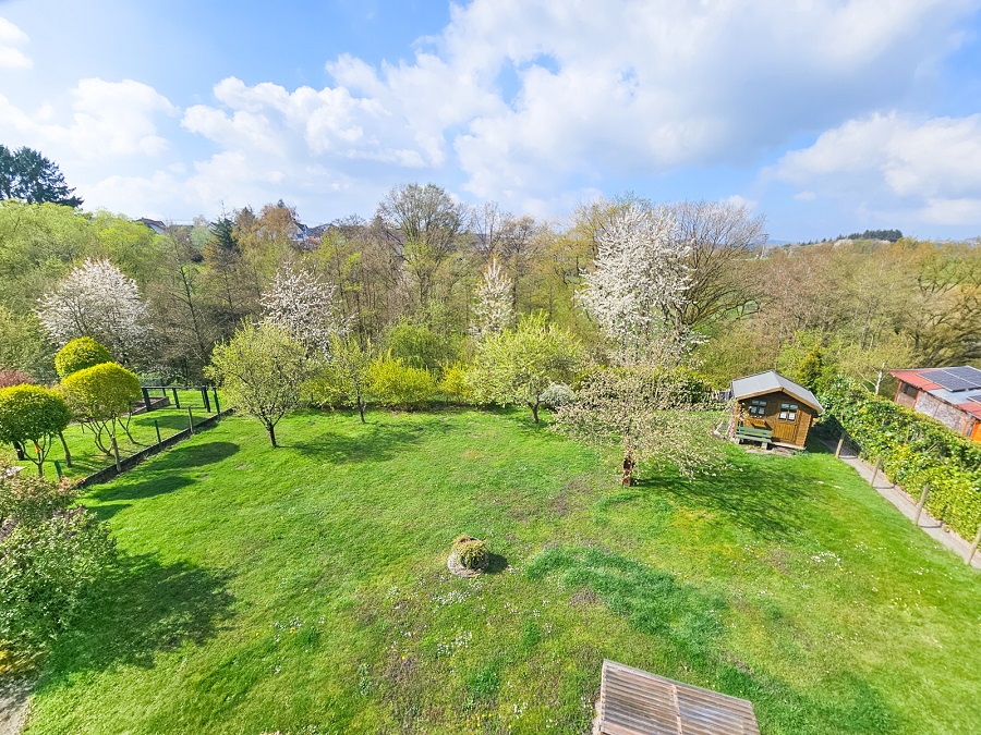Die ebene Wiesenfläche mit Baumbestand und Gartenhaus ist eingezäunt, die Zufahrt zur Garage ist mit einer elektrischen Toranlage ausgestattet.