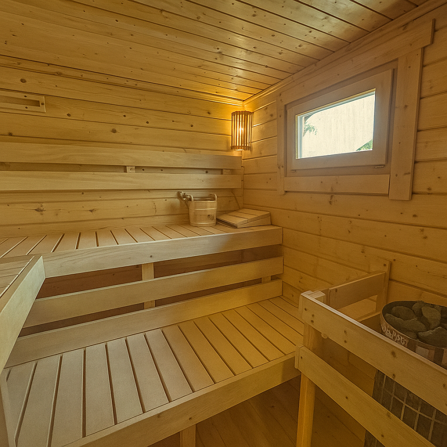 Zur Ausstattung gehören außerdem ein Duschbad sowie eine Sauna (6,8 kwH) – ideal für entspannte Stunden nach einem langen Tag in der Natur.