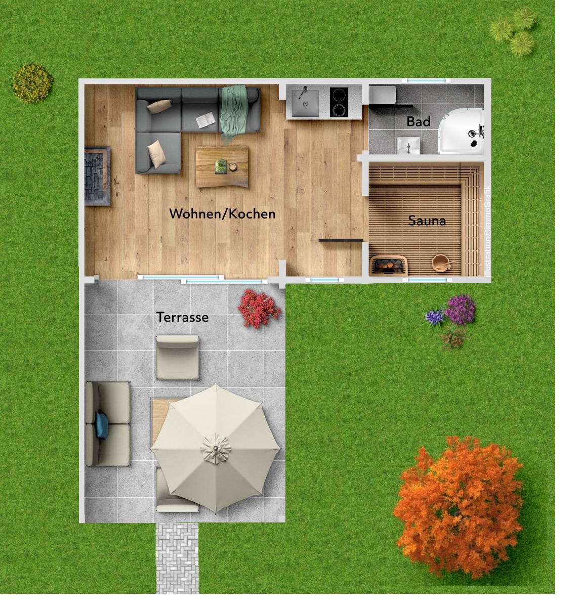 Über die ca. 13 m² große Terrasse, auf der Sie im Sommer den Sonnenuntergang genießen und dem sanften Plätschern des Wassers lauschen können, gelangen Sie direkt in das gemütliche Wohnzimmer mit integrierter Kochnische.