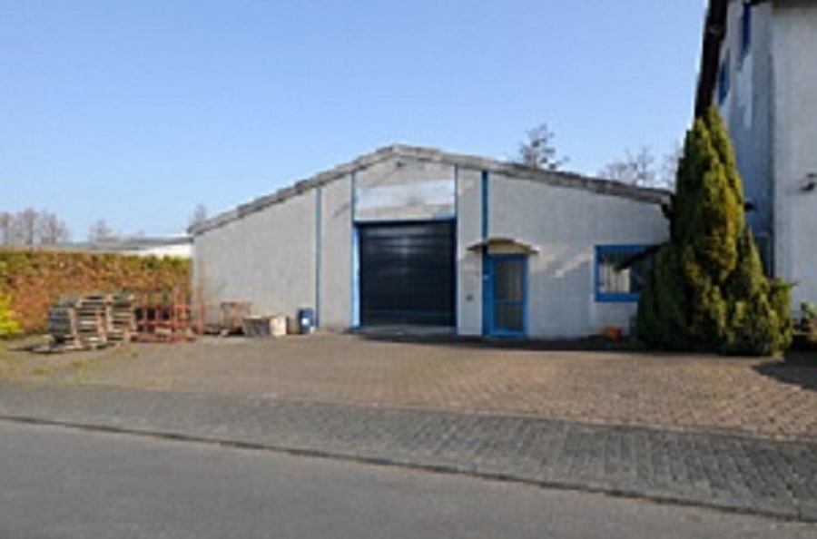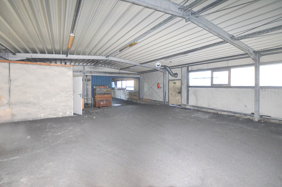 „Halle 1‘‘ (Baujahr 1991/1992) mit ca. 300 m² Nutzfläche sowie einem ‘‘Anbau‘‘ von ca. 70 m² Nutzfläche. Hier sind Sozialräume, Duschen und ein Büro im seitlichen Bereich untergebracht. Über den Anbau besteht ein Zugang zur Halle 2.